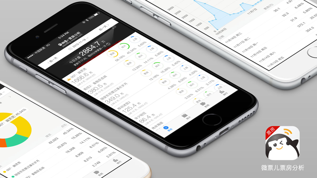 Wepiao Boxoffice app provides huge amounts of data and visualization of movies and cinemas including times, box office, attendance, ranking with a real-time analyzing back-end, which available on Web, iOS and Android.